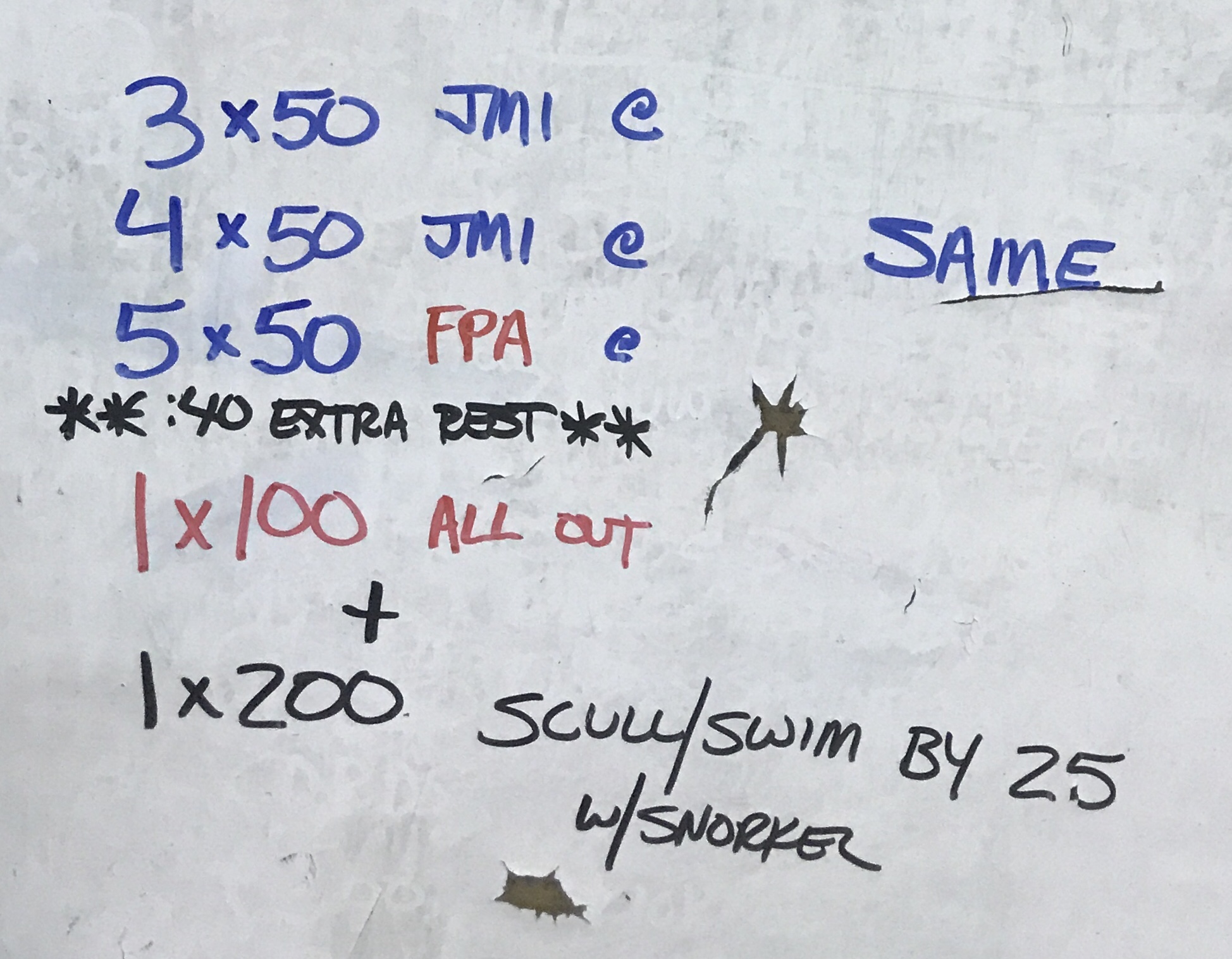 SCM. This set came in three parts and really challenged our swimmers. They could do back or breast for all three parts, and were instructed to choose the interval that made the FPA (fastest possible average) set challenging. We did 2 rounds.