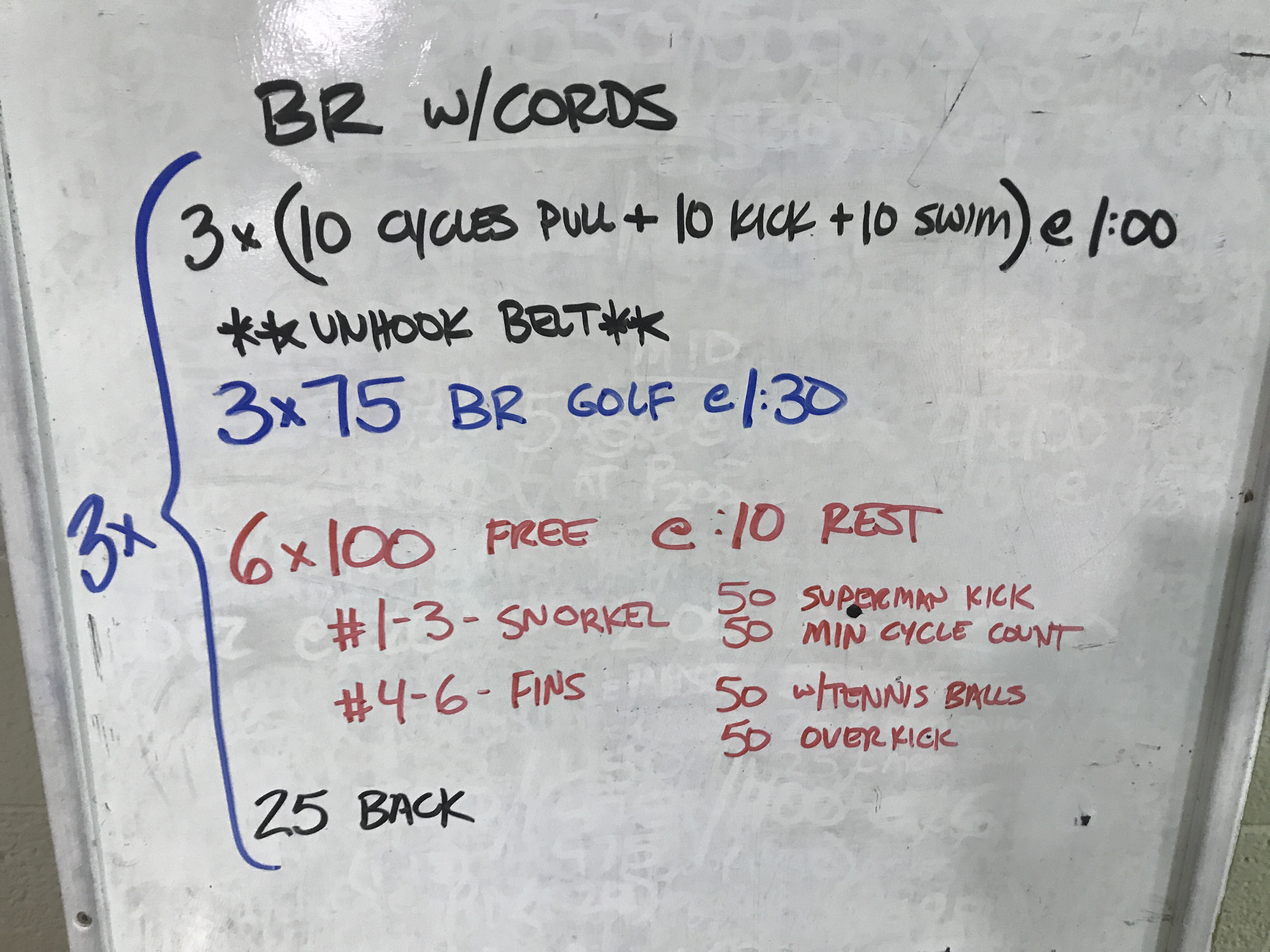 Hit 30 cycles of breaststroke on the cord. The 75s focus on dropping the sum of time and cycles (GOLF). 100s free totally focused on technique.