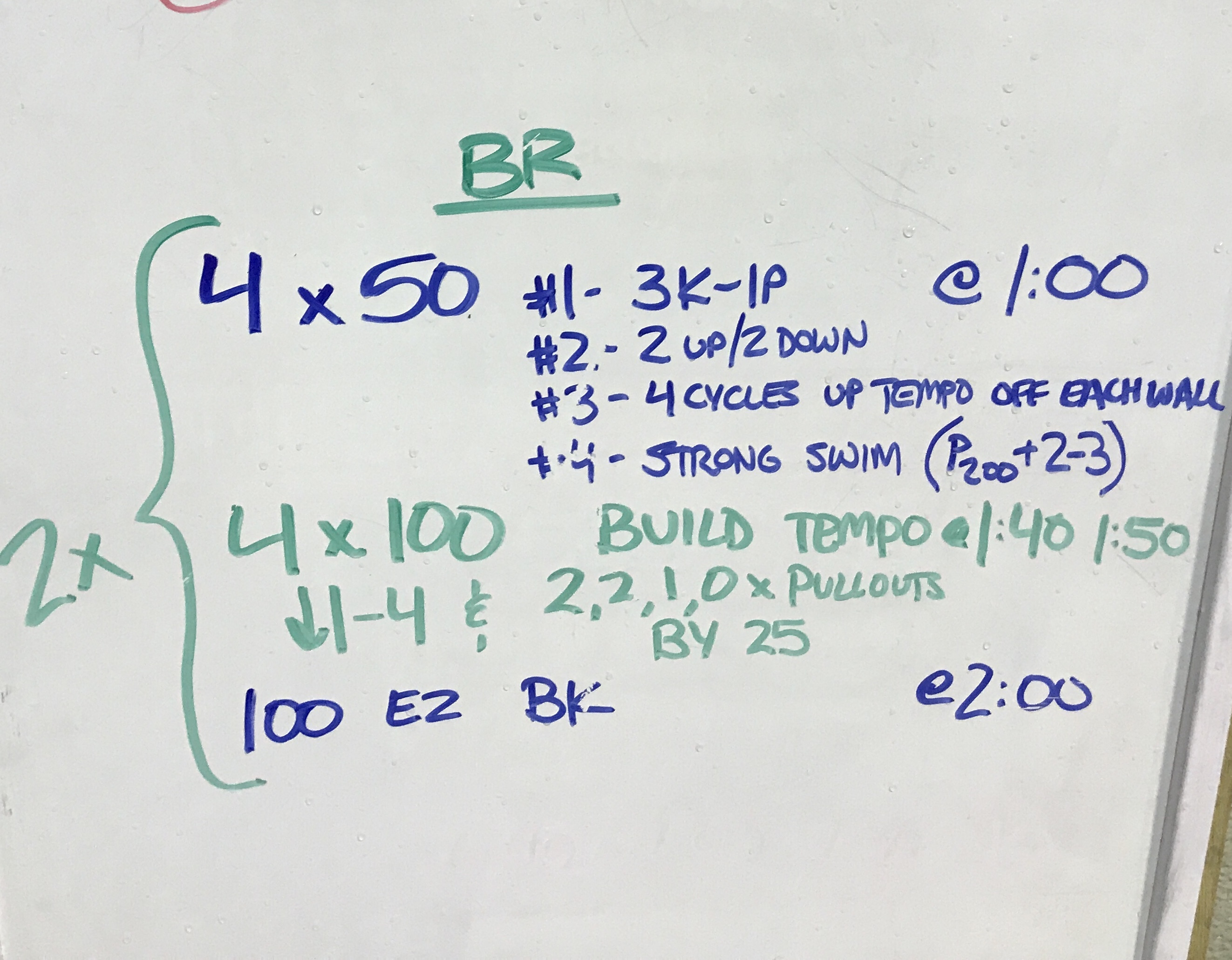 This set allowed us to keep the group together while some swimmers trained back and others trained breast. This was a small group at an early morning practice, so keeping the group together was helpful for keeping the energy up.
