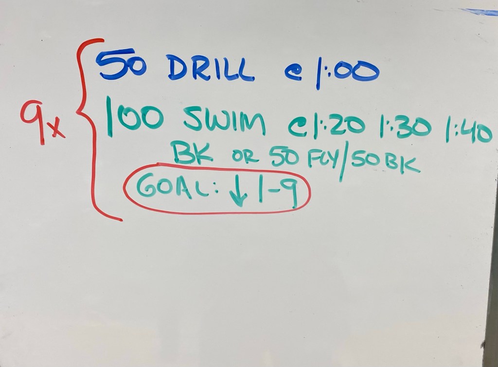This set was a good challenge for our group in the second week of practice. For backstrokers, this set was all backstroke. For IMer/Fly types, they went 50fly/50back and could choose either stroke to do for the drill.