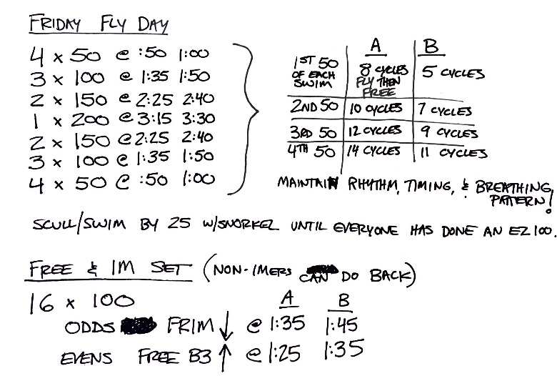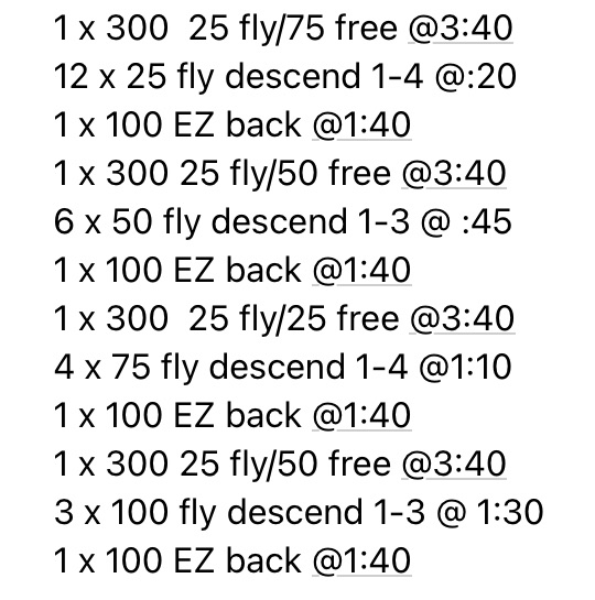 The purpose of this set was for us to get some medium-intensity butterfly reps in during some aerobic freestyle. We interspersed that with some brief fly sprints on large rest. Performance was solid on this one, but not amazing probably due to a difficult practice the day before. SCM.