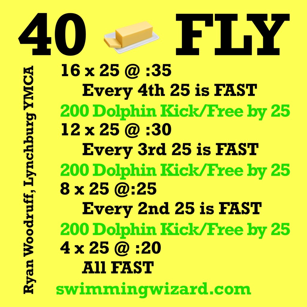 We did this one recently for some good butterfly work on a day when we had more swimmers present than could train effectively in the space available. We split into two groups – one group would do the swimming set while the other group did dryland set on the deck, and then they switched. The dryland exercises always takes less time, so that allows for some rest before starting the next fly set.