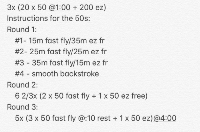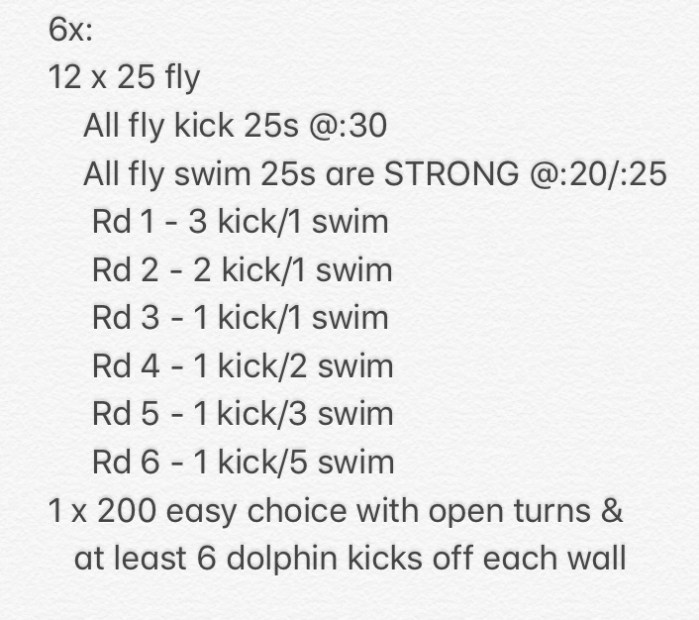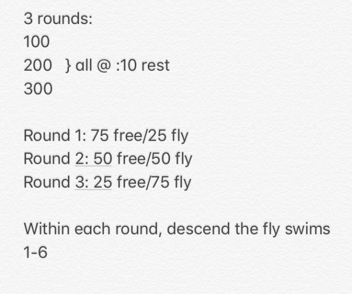 Each round progressively more challenging with last round mimicking 200 fly fatigue with 50s @ :10 rest instead of 1:00.