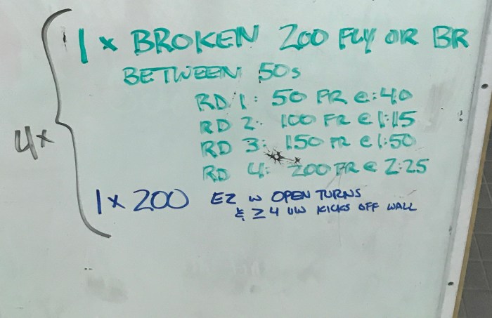 The last part was essentially a broken 400 IM. Swimmers said they liked the set and did well on the last portion.