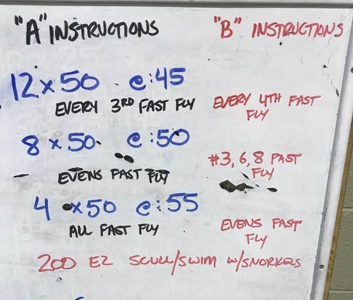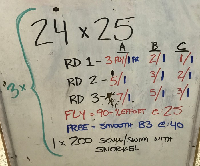 We had 18 swimmers and split up into 5 relay teams (2 teams of 3 for stronger flyers, 3 teams of 4 for less-skilled flyers). Relays always help us get good quality fly done without the need to “dodge” one another.