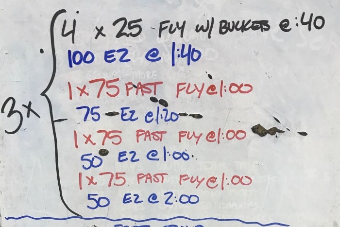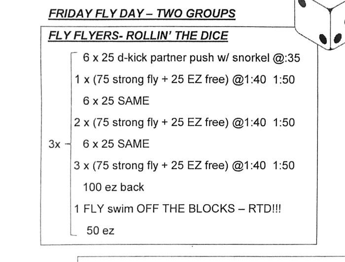This set was for SCM, and we had a “roll the dice” component just like the Flyers. In the case of the distance group, we rolled two dice and added the numbers rolled together to determine how many 50s we would do at the end of the set. The 50s were fly/free by 25 and hitting P1000 turned out to be a tough yet appropriate challenge.