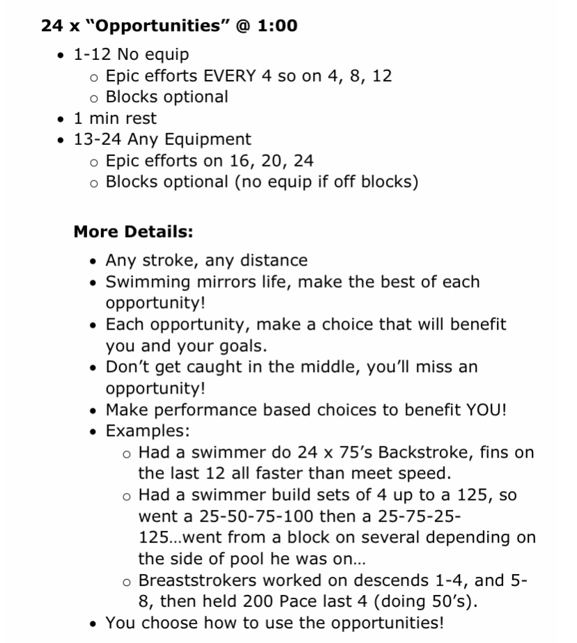 I like our distance sets to also include some technical focus. This set seemed to do the trick. The “Deep Practice” points of emphasis correspond to the 1st, 3rd, and 5th 50s of the 300. The swims written in black are meant to be descending effort (getting faster) on an increasingly tighter interval. At the end of the set, we recorded 10-sec heart rate values for swimmers immediately upon finishing 30 seconds after finishing, and 60 seconds after finishing. B3 = breathing every 3 strokes. This set was performed in a SCM pool. 39-43 minutes, 3,000m.