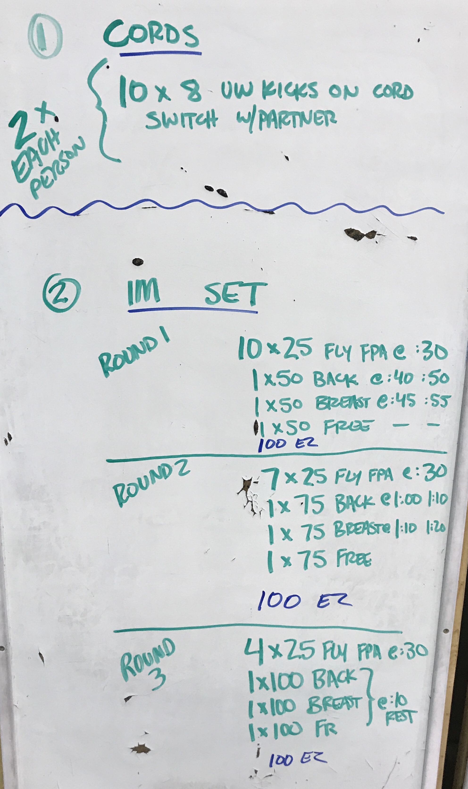 This workout involved two stations – one working underwater kicks and one doing an IM set. We did each station 3 times — the cord set was the same each time, and the IM set progressed through the three versions listed. The 3rd round was essentially a broken 400 IM.