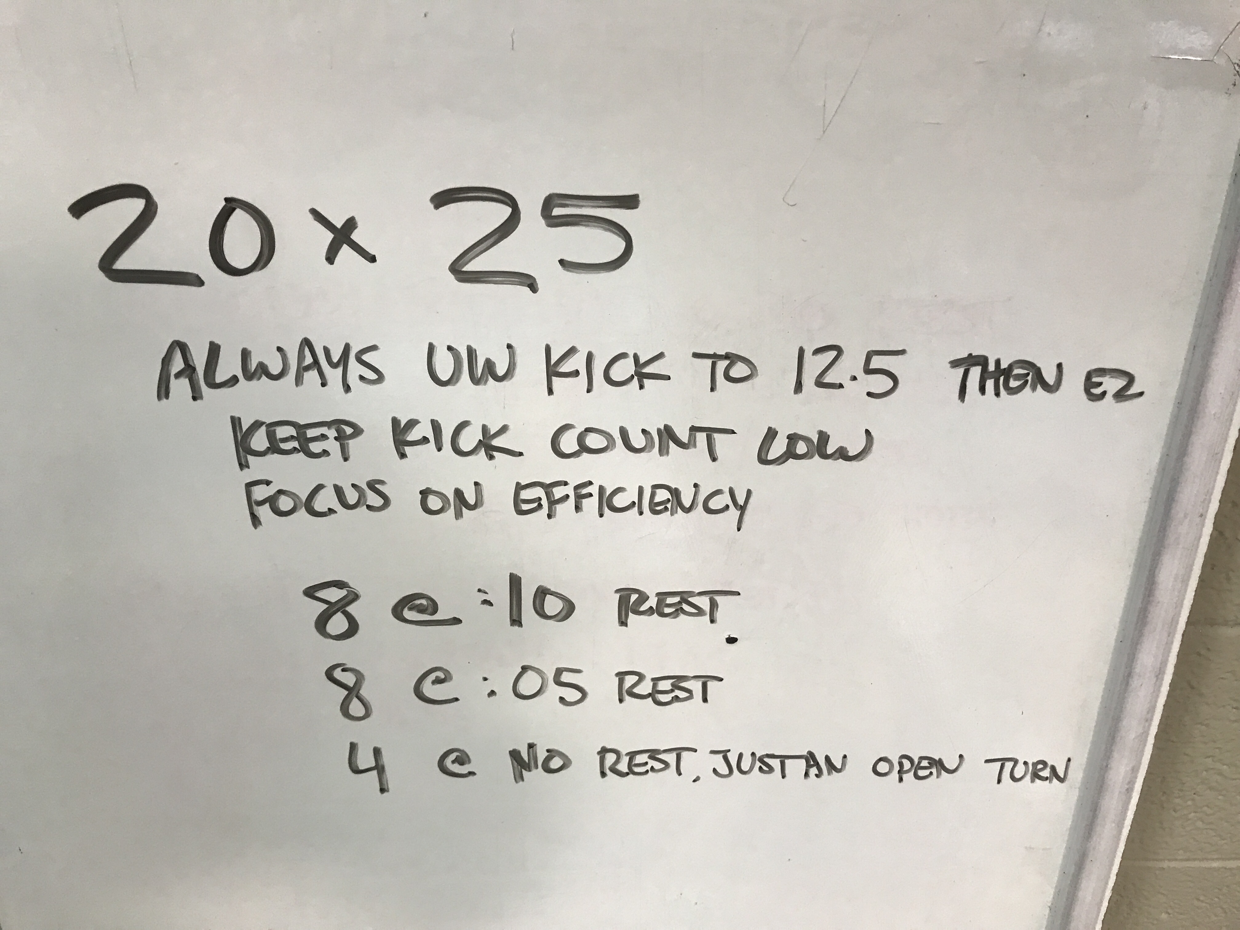 This was our finish to practice today. We have done 25s underwater pretty consistently, so every swimmer knows his or her best time. The lifetime bests were written down on a dry erase board and this challenge was thrown. If you can beat your best twice, you get to go home. Amazingly, more than half of our swimmers were able to accomplish this feat. The mind is an amazing thing!