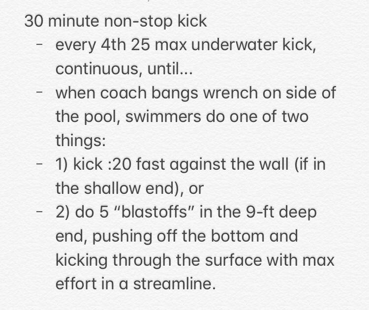 We are currently able to practice with three swimmers per lane, and this kick set allowed us to get some excellent leg work in while keeping our distance.