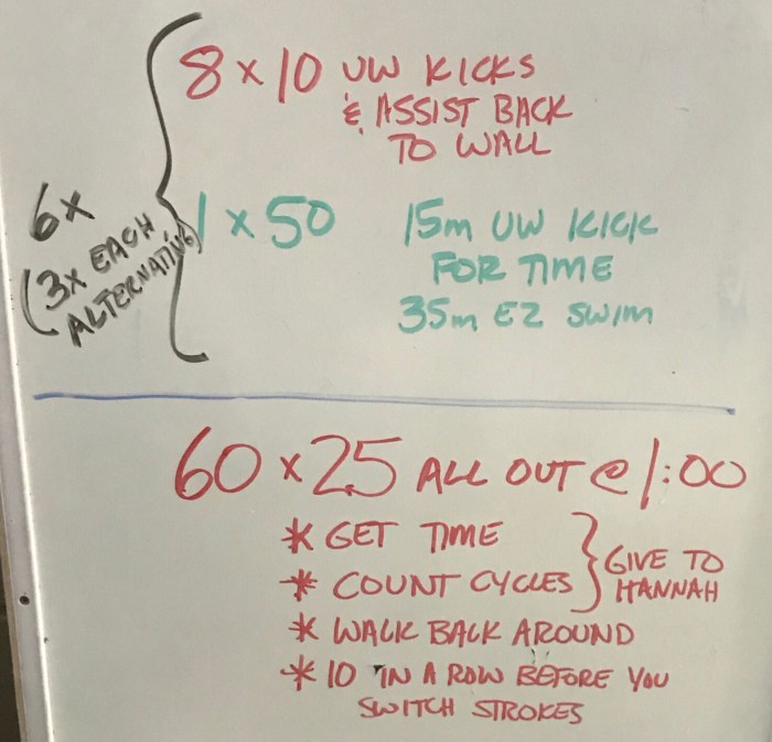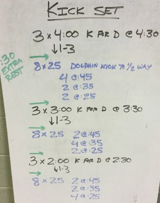 We almost always use it as a fin set. We train in a 25 meter pool. The basic set is 4 under – 1 recovery (we call it “over”) , 3 under – 1 recovery, 2 under – 1 over, 1 under – 1 over. We usually repeat it 4 times though. Today we went with a variation to work our butterfly and up tempo our Freestyle.