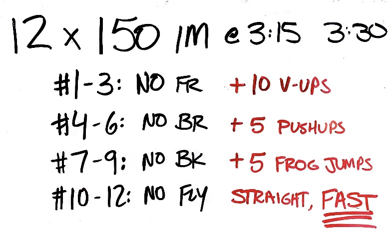 We did this one recently for some good butterfly work on a day when we had more swimmers present than could train effectively in the space available. We split into two groups – one group would do the swimming set while the other group did dryland set on the deck, and then they switched. The dryland exercises always takes less time, so that allows for some rest before starting the next fly set.