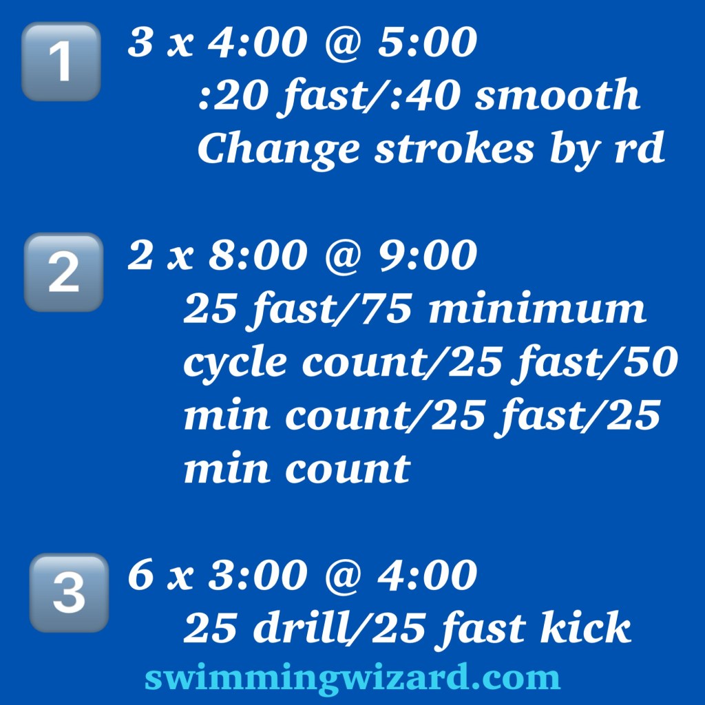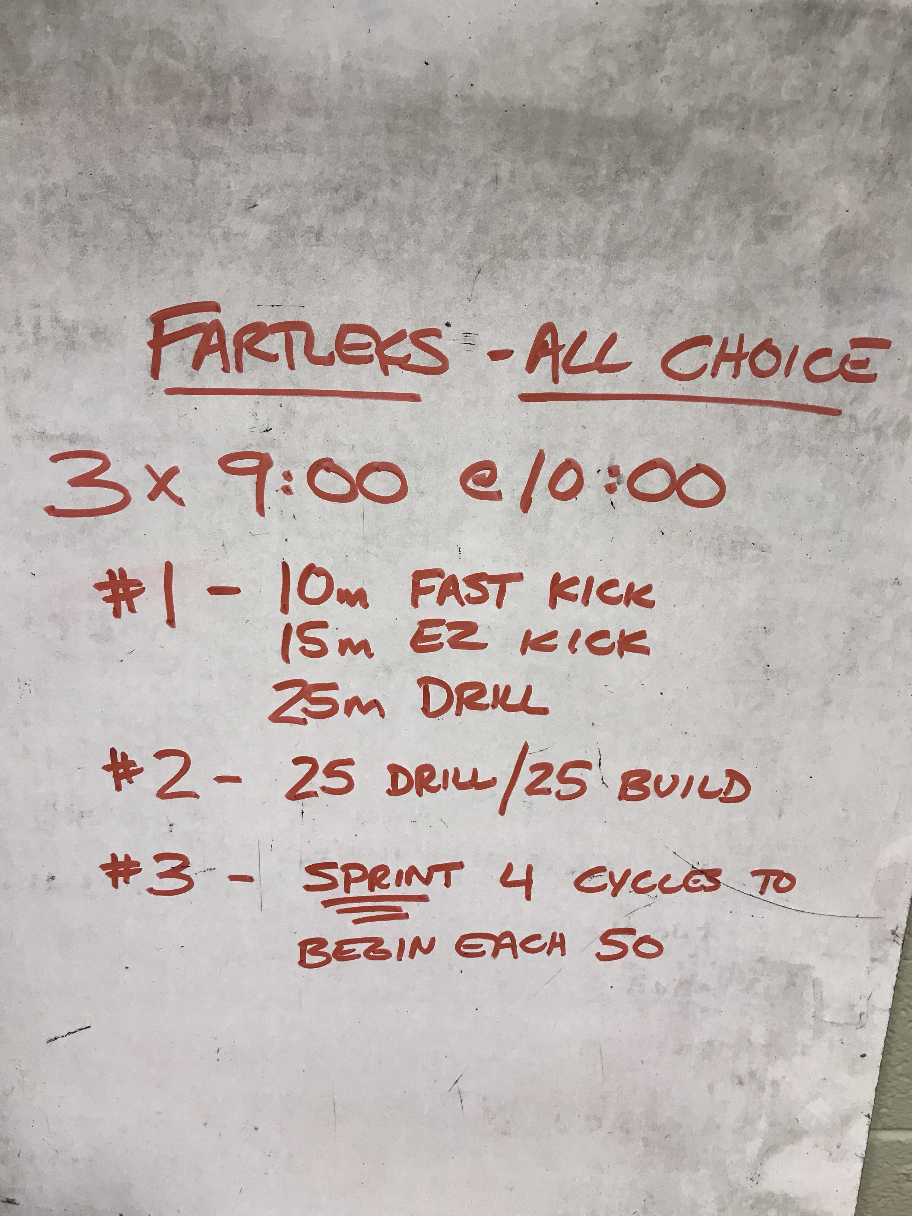 We occasionally use “fartleks” (non-stop swims with changing instructions or speeds) to get in some aerobic swimming with good technique and no interval pressure.