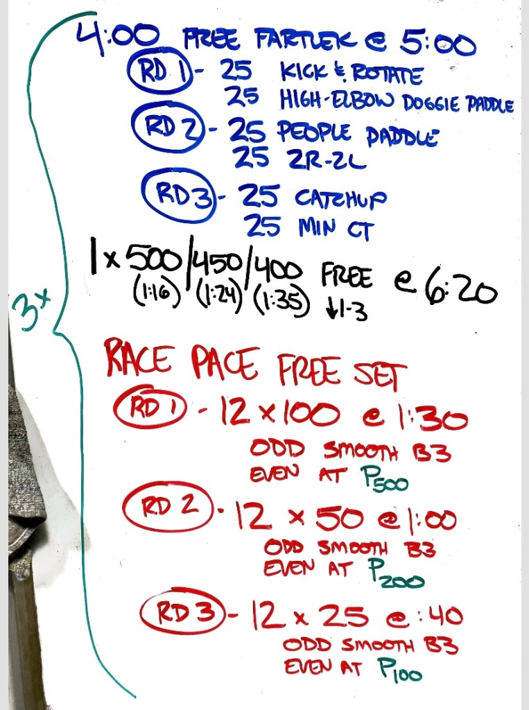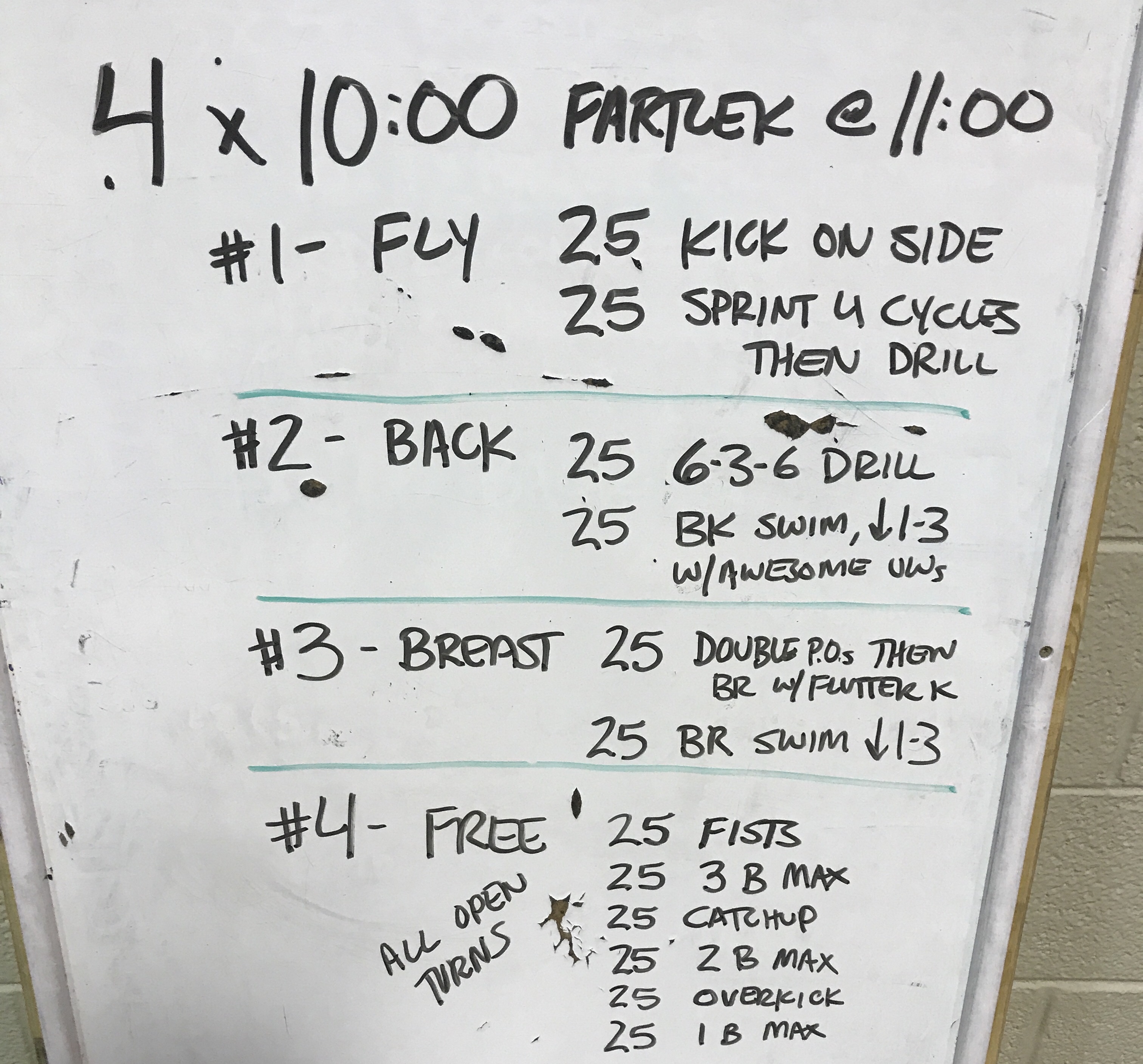 SCY. We use the term “fartlek” to mean a continuous swim where we are changing speeds or instructions. In this set, we alternated a fartlek with a brief freestyle set. Swimmers were on either the more “distance-y” left side (milers) or the more middle distance-oriented right side. We came together for the 150s FPA (fastest possible average) at the end.