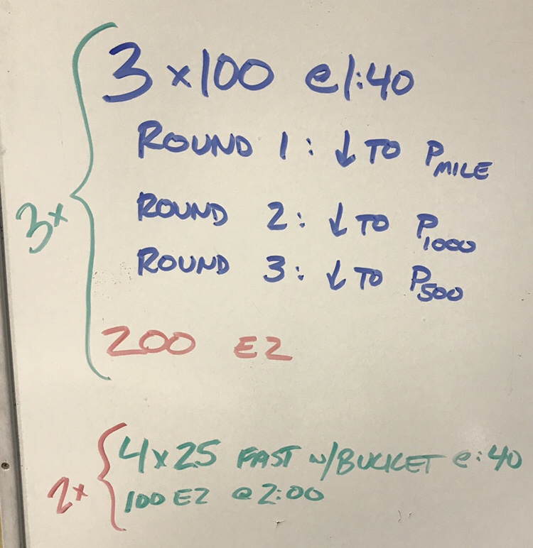 This set was for SCM, and we had a “roll the dice” component just like the Flyers. In the case of the distance group, we rolled two dice and added the numbers rolled together to determine how many 50s we would do at the end of the set. The 50s were fly/free by 25 and hitting P1000 turned out to be a tough yet appropriate challenge.