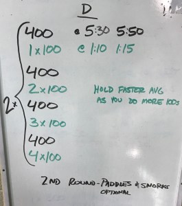 This set was for SCM, and we had a “roll the dice” component just like the Flyers. In the case of the distance group, we rolled two dice and added the numbers rolled together to determine how many 50s we would do at the end of the set. The 50s were fly/free by 25 and hitting P1000 turned out to be a tough yet appropriate challenge.