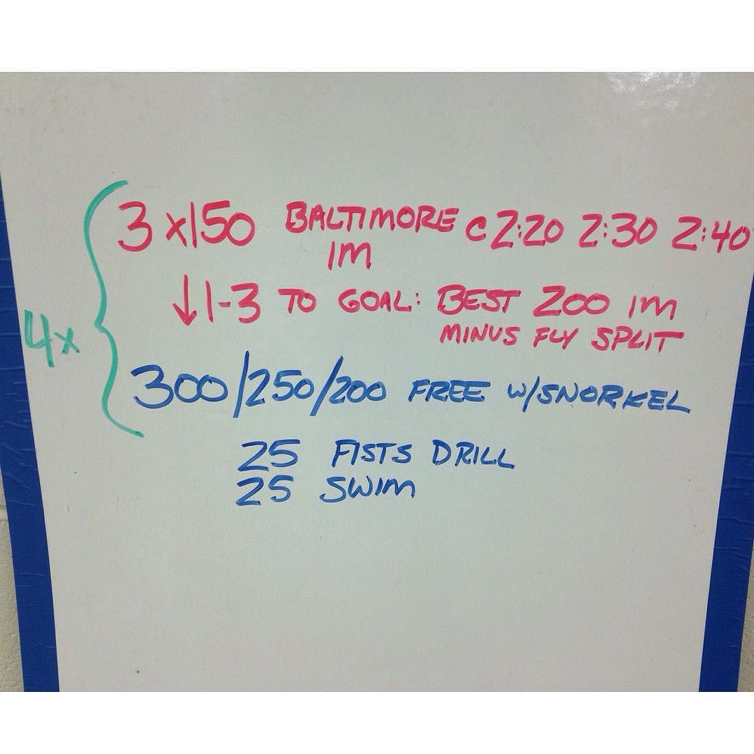 We have had a similar set posted on this blog before. The concept here is that swimmers should be able to perform the last 150 of a 200 IM race at practice. It is a challenging goal, but one that our swimmers achieved approximately 60% of the time during the workout today. I added in the freestyle to include a little technique work and some active recovery.