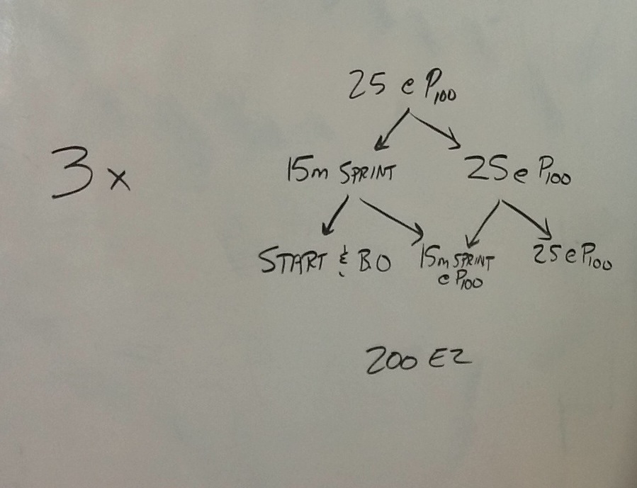 This set provides some incentives for fast swimming. The picture below explains the process of the Pyramid. All swimmers begin with a 200 for time with the goal of being within 6 seconds of lifetime best (girls) or 8 seconds (boys). 100 easy for all, and then those that failed will do a broken 200 (75-50-50-25 @:10 rest) while those that succeeded in reaching the goal will do a broken 100 (50-50@:10rest). The goal on the broken 200 is a lifetime best. The goal on the broken 100 is within 2 seconds of lifetime best. The second swim is followed by another 100 easy, and based on a swimmer’s success or failure he then completes either a broken 200 (75-50-50-25@:20 rest), a broken 100 (50-50@:10 rest), or an all-out dive 50. The goals are a lifetime best, a best +3 or faster, and the starting 50 split for a lifetime best 100, respectively. Success or failure on the 3rd swim leads to 10 push-ups or a “Hooray!”