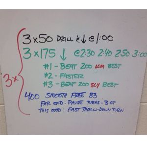 The purpose of this set is to challenge swimmers by having them swim at paces and for distances that gradually approach 200 race pace. When we did the set, we started with 175s all freestyle, and then progressed to the 180s and beyond done as athlete’s choice of stroke. Swimmers were timed to a hand touch on the 175s, and then were timed to their head breaking the line. We used a cone on the side of the pool and multiple cones on the bottom of the pool to mark the required distance. Our swimmers were very successful making the goal time (lifetime best time) all the way through the 190 yards and several were successful at the 195y distance.