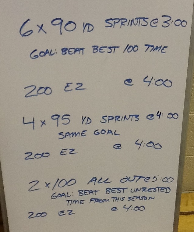 – Goal: Beat your best 100 yard time. In order to meet this goal, athletes had to swim at around 93% of race pace, as 85m is about 93 yards. I estimated that this would be a difficult challenge for seven consecutive swims that began after we had already been practicing for an hour.