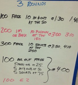 This set combines elements of dryland with a normal swimming set. I like this as a change-of-pace and a way to challenge our athletes that they don’t see every day. The dryland exercise comes mid-swim and throws in a bit of fatigue. We timed the 100 all out and really got some excellent efforts.