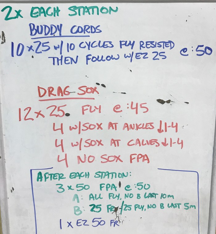 For the Drag Sox, the Set utilizes the Sox worn in two different ways. Sox at the ankles provides high resistance to the kick. Moving them up to the calves provides a little less. Taking the Sox gives the swimmers the boost of a fully involved kick for the last 2×25.