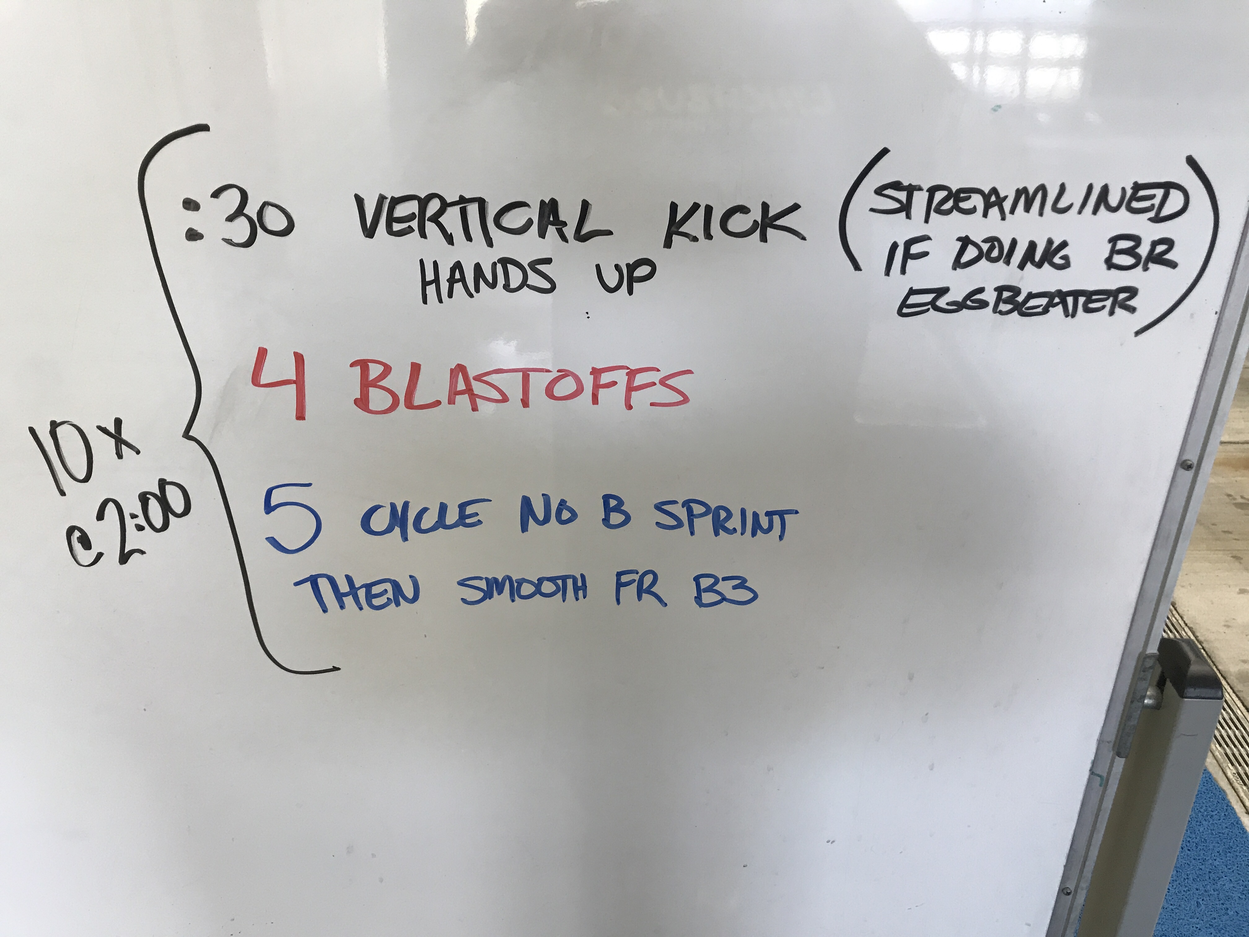 LCM. The purpose of this set was to get us primed and ready for our main set. We did this in about 8 feet depth – the blastoffs involve sinking down to the bottom, pushing off, and exploding vertically through the surface while dolphin kicking. After the 5 sprint cycles, swimmers continued the rest of the 50 smooth.