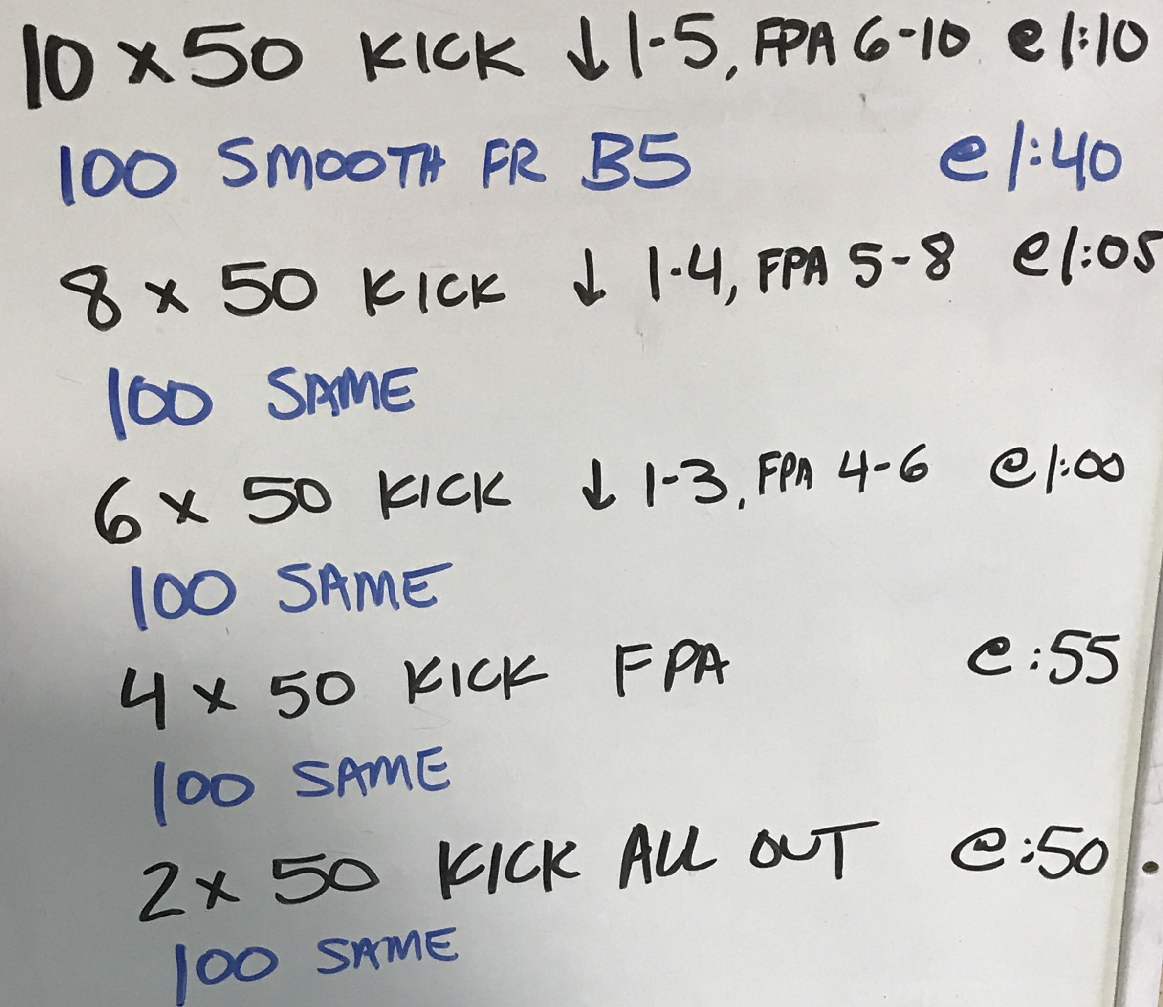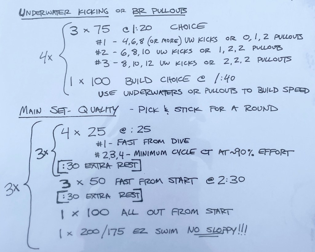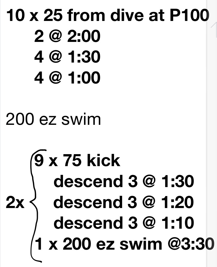 The ? for the fly swims off the blocks were a 50, 100, 150, and on the 4th round swimmers had the option to do a 200 or to do a 100 with the goal to beat the time from round 1 (or face a second 100 from a dive). This set went very well for us.