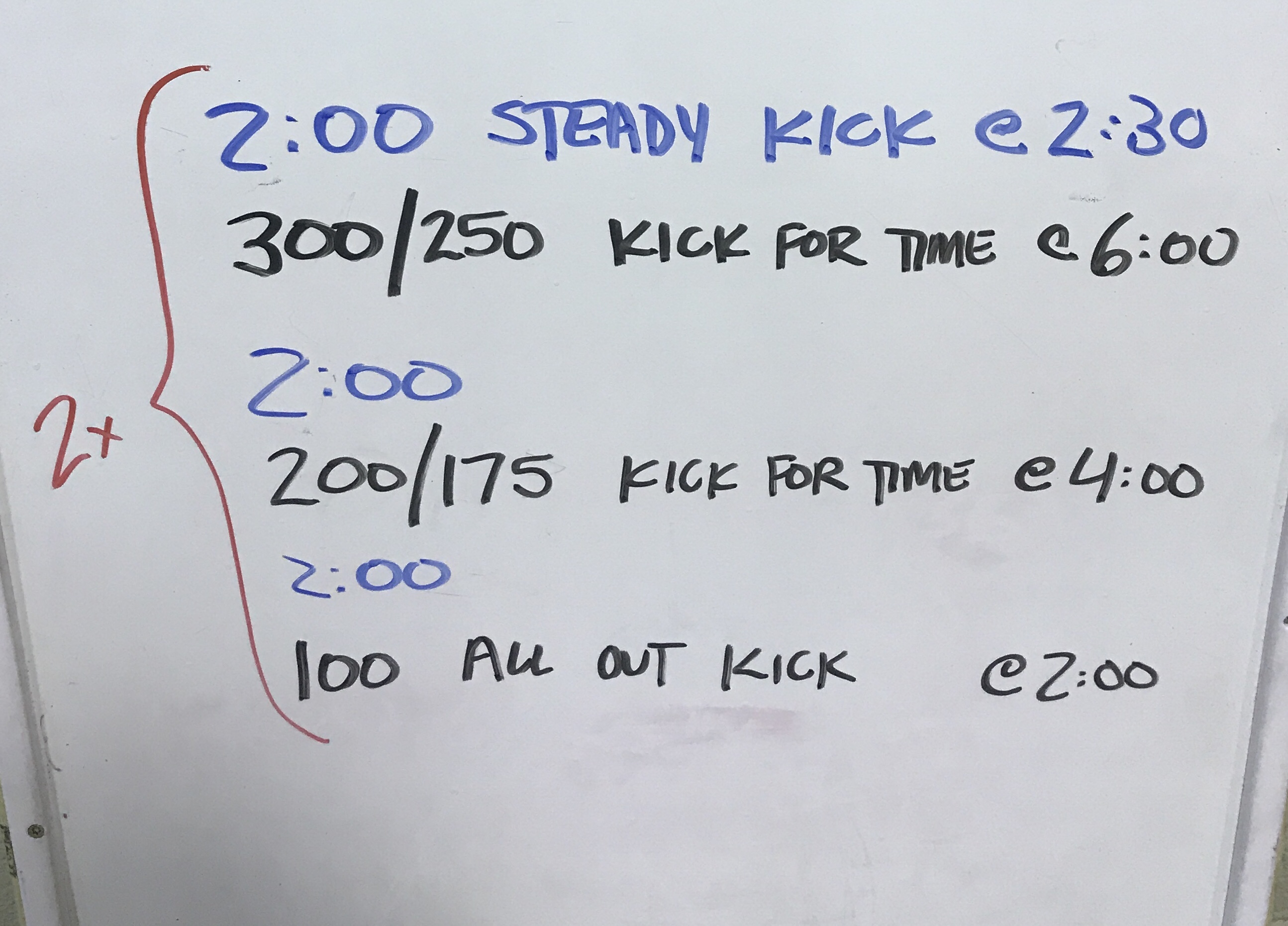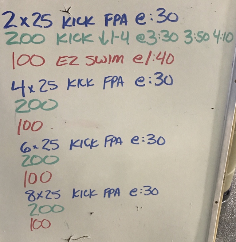 We are currently able to practice with three swimmers per lane, and this kick set allowed us to get some excellent leg work in while keeping our distance.