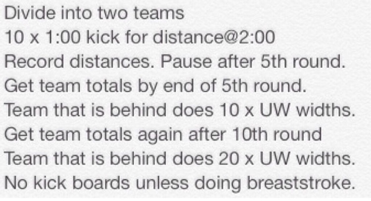 This kick set was able to provide a good challenge for everyone in our group, regardless of their kicking ability. Intervals were the same across the group for the 25s until the last round. Swimmers chose their longer distance based on kicking ability.