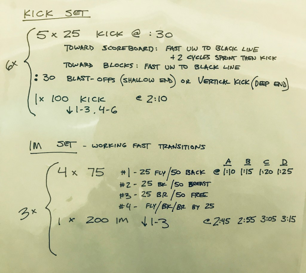 This was our SCY workout this morning. The race pace set at the end came from Mike Anzano of COM Aquatics