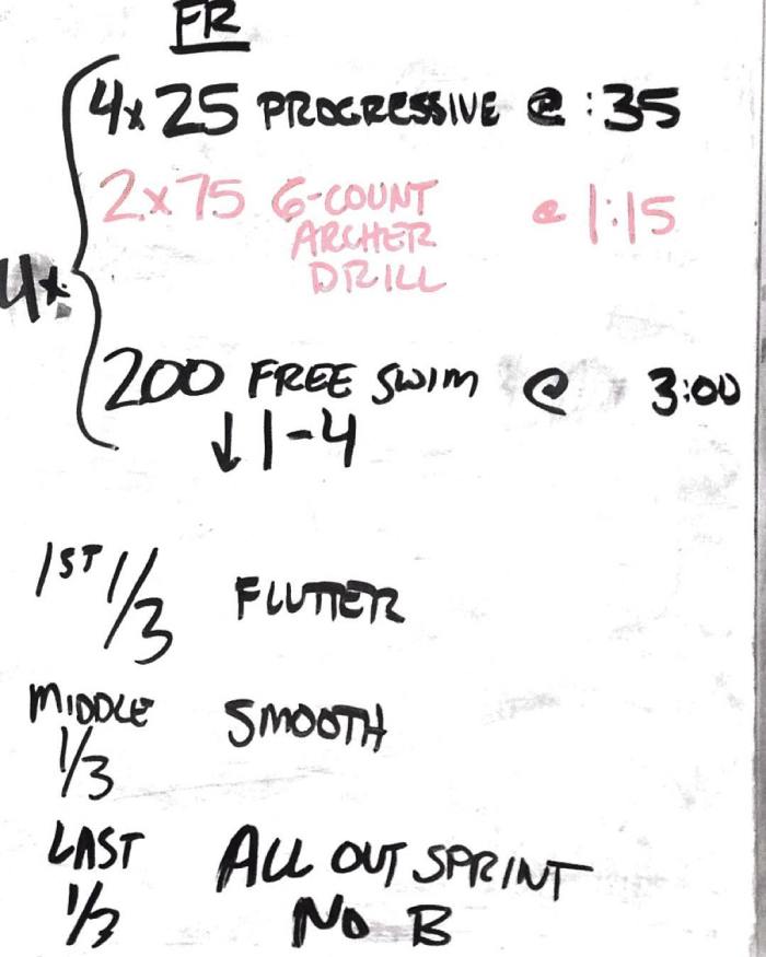 We also do a Sprint Challenge Circuit. Each part of the challenge is about a month apart. No intervals – swimmers go when they are ready. A pre-meet warm-up precedes the set. Active recovery is encouraged, but not required. Swimmers get 5 failures at any step before the set is cut off. If a swimmer tries 5 times without meeting goal, the set is over and they are out of the set – send them to a different training group…