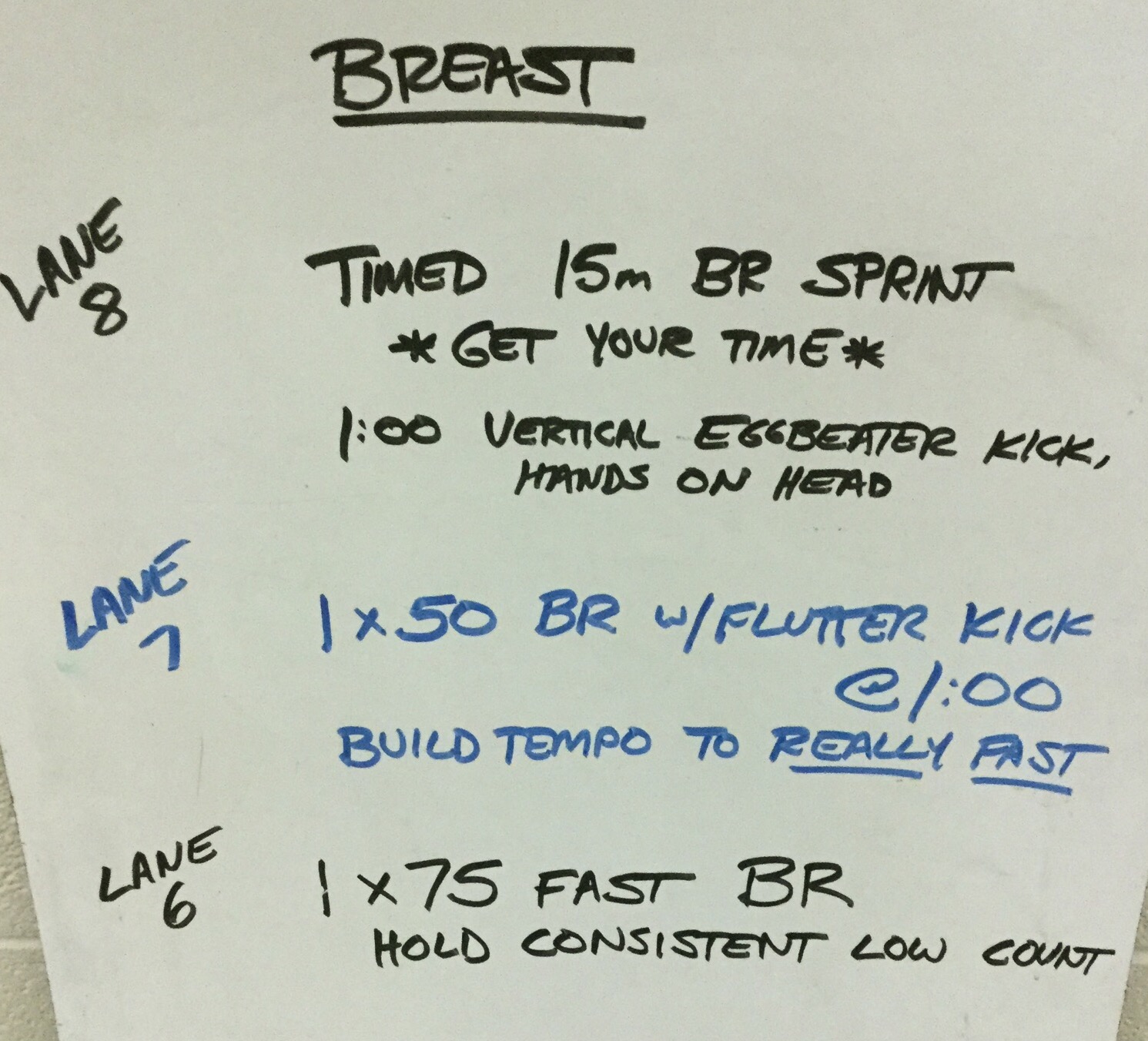We performed the set below with our sectional-level breaststroke group. There are essentially two parts to the set. The first part (above the dotted line) stresses technique with a LONG stroke and gradually builds to an up-tempo stroke at the end of the 100s. During this first part, “TT” stands for the Finis Tempo Trainer Pro which we use on a regular basis. Using mode 1, we have it set at 4.00, meaning the swimmer initiates a stroke once every 4 seconds. This is usually an uncomfortably long time to glide for our swimmers (a good thing!). We bring the TT down to 3.00 for the 2 x 150 and then to 2.00 on the 100s and have the swimmers shoot for 2 strokes during the 2.00 seconds in the last 10-15 yards of each 100. This combination of technique and tempo sets them up well for the second part of the set.
