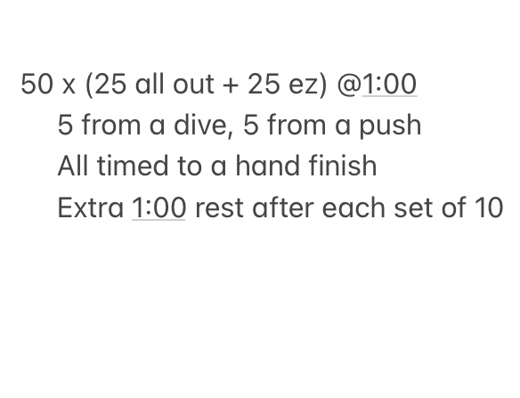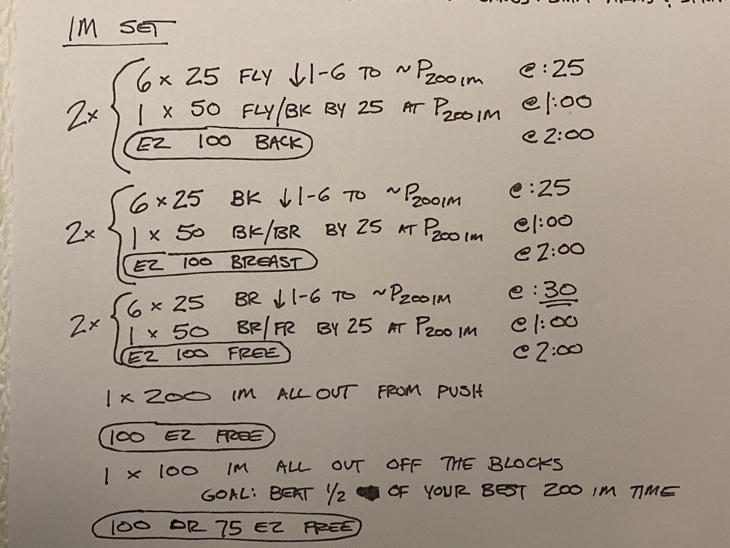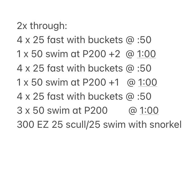 This is a set we did recently (Sept 17). Since we’re early season we are focusing 200 for everyone in the group today. The set was supposed to be +2 on 200 pace but everyone exceeded expectations. It went so well I had to share it. It’s about 4500 short course meters.