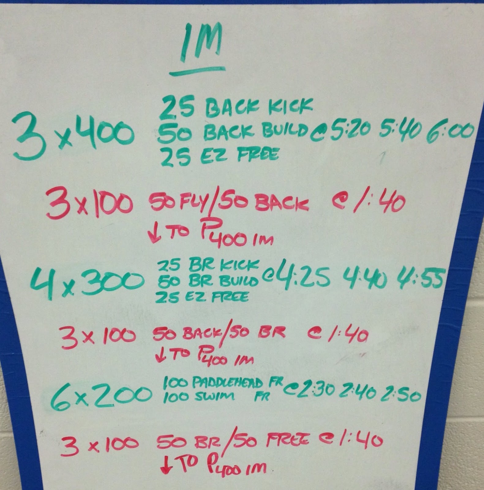 We had great success with the set below. Red portions are all based around goal 400 IM pace based on our current actual splits. We used our pace cards to determine these splits.