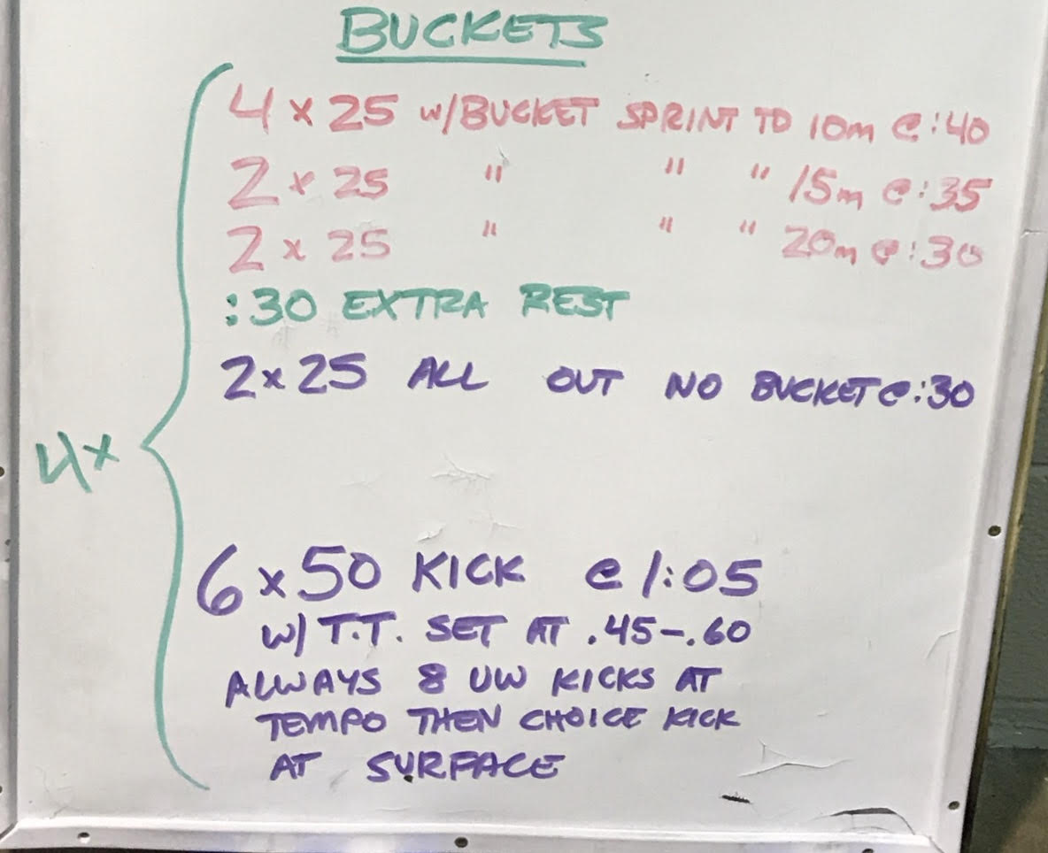 On the 3rd 25 with the bucket (1-gallon bucket on a rope tied to a waist belt), the swimmers got only enough rest to take off the bucket before starting the 50s.