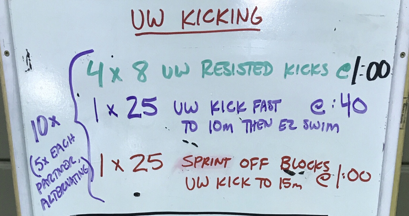We did this set at the end of a long practice that included dryland that was heavy on the legs and a long kick set. The goal was to work some underwater power and then get some “lightning speed” underwater kicks at the end of each round. It worked well, with a few of our swimmers setting personal bests & team records at the 25m underwater kicking distance.