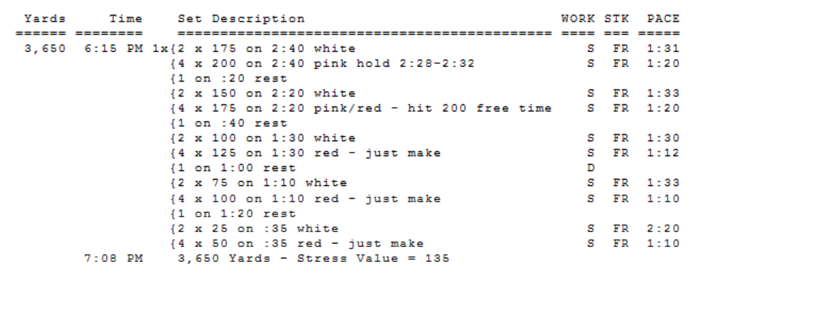 This is a set I created for our advanced age group kids. Putting the rest between each section really allowed the kids to focus on one part at a time. We had a great effort. For some it was touch and go for the 100s and 50s, but everyone made the intervals.