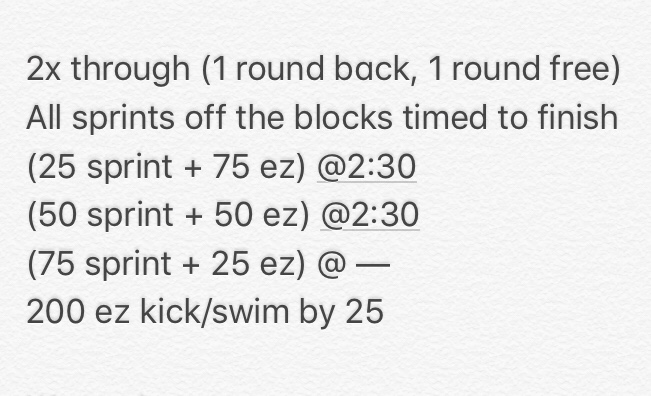 Each round of this set, we swapped in a mystery set that the swimmers did not know ahead of time as the “unique challenge” in brackets.