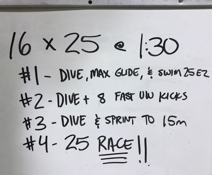 We also do a Sprint Challenge Circuit. Each part of the challenge is about a month apart. No intervals – swimmers go when they are ready. A pre-meet warm-up precedes the set. Active recovery is encouraged, but not required. Swimmers get 5 failures at any step before the set is cut off. If a swimmer tries 5 times without meeting goal, the set is over and they are out of the set – send them to a different training group…