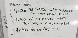We performed the set below with our sectional-level breaststroke group. There are essentially two parts to the set. The first part (above the dotted line) stresses technique with a LONG stroke and gradually builds to an up-tempo stroke at the end of the 100s. During this first part, “TT” stands for the Finis Tempo Trainer Pro which we use on a regular basis. Using mode 1, we have it set at 4.00, meaning the swimmer initiates a stroke once every 4 seconds. This is usually an uncomfortably long time to glide for our swimmers (a good thing!). We bring the TT down to 3.00 for the 2 x 150 and then to 2.00 on the 100s and have the swimmers shoot for 2 strokes during the 2.00 seconds in the last 10-15 yards of each 100. This combination of technique and tempo sets them up well for the second part of the set.