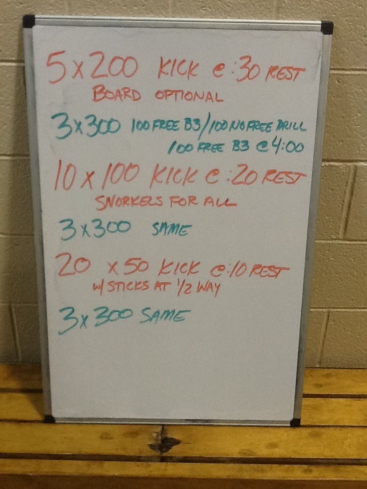 This is a test we do at least 1/season (often 2). I keep all results and have an all-time spread sheet of overall time and times for each effort. This way, swimmers can compare progress from 1st-2nd semester, as well as over course of career at Bridgewater. It started as a way to get the swimmers more comfortable on the blocks, and more able to swim back to back events during dual meets. Mostly, its a mental challenge because it is all the individual events of a college dual meet (short order) back to back, all best effort. I try to do it toward the end of our overload training period to mark the occasion 🙂 Though they complain about it – it occupys a positive tradition in our program