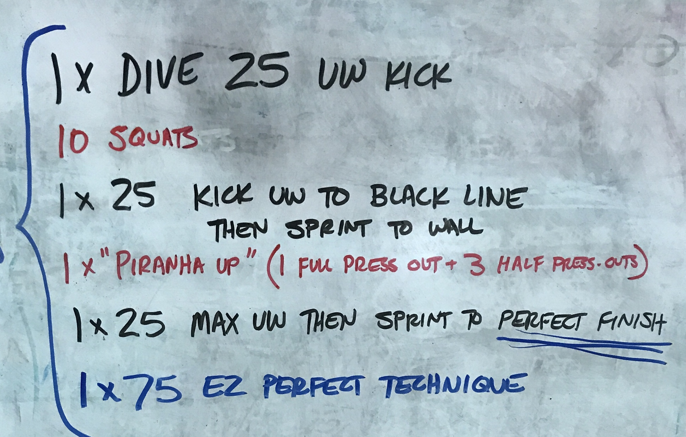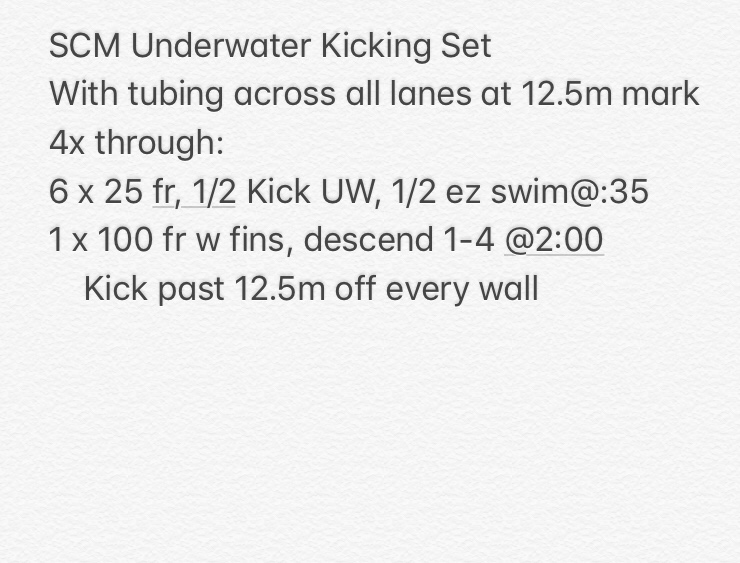 This is part of a practice I did recently with our top 11-12s. Our main focus was on underwater kicking. Our pool has a black line across the bottom approximately 9 yards from the wall.