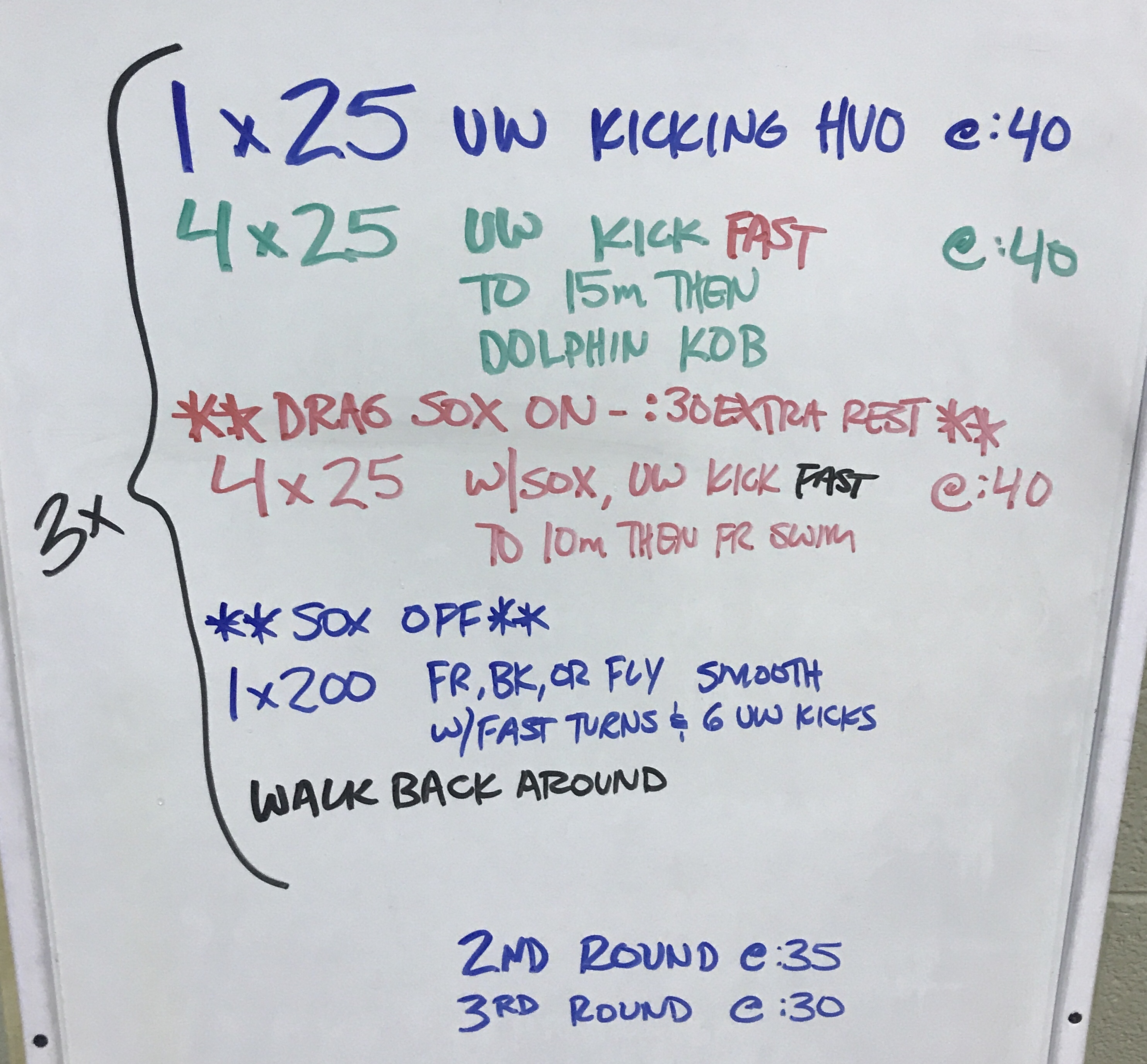 We did this set on the first day of a new season. On the 300s, the focus was on doing effective underwater kicks, making them progressively faster on the 200s and 100s.