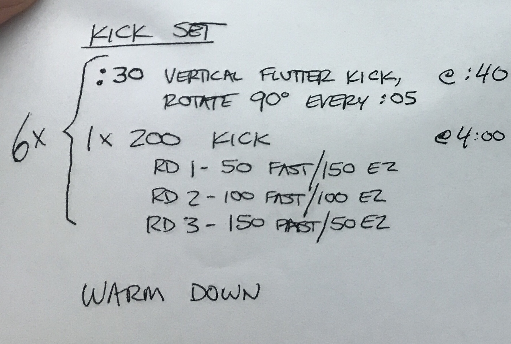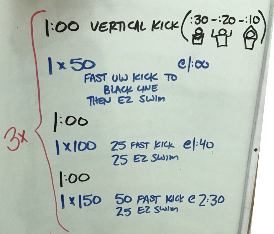 – 3 minutes vertical kick – last 45 seconds all out kick in streamline