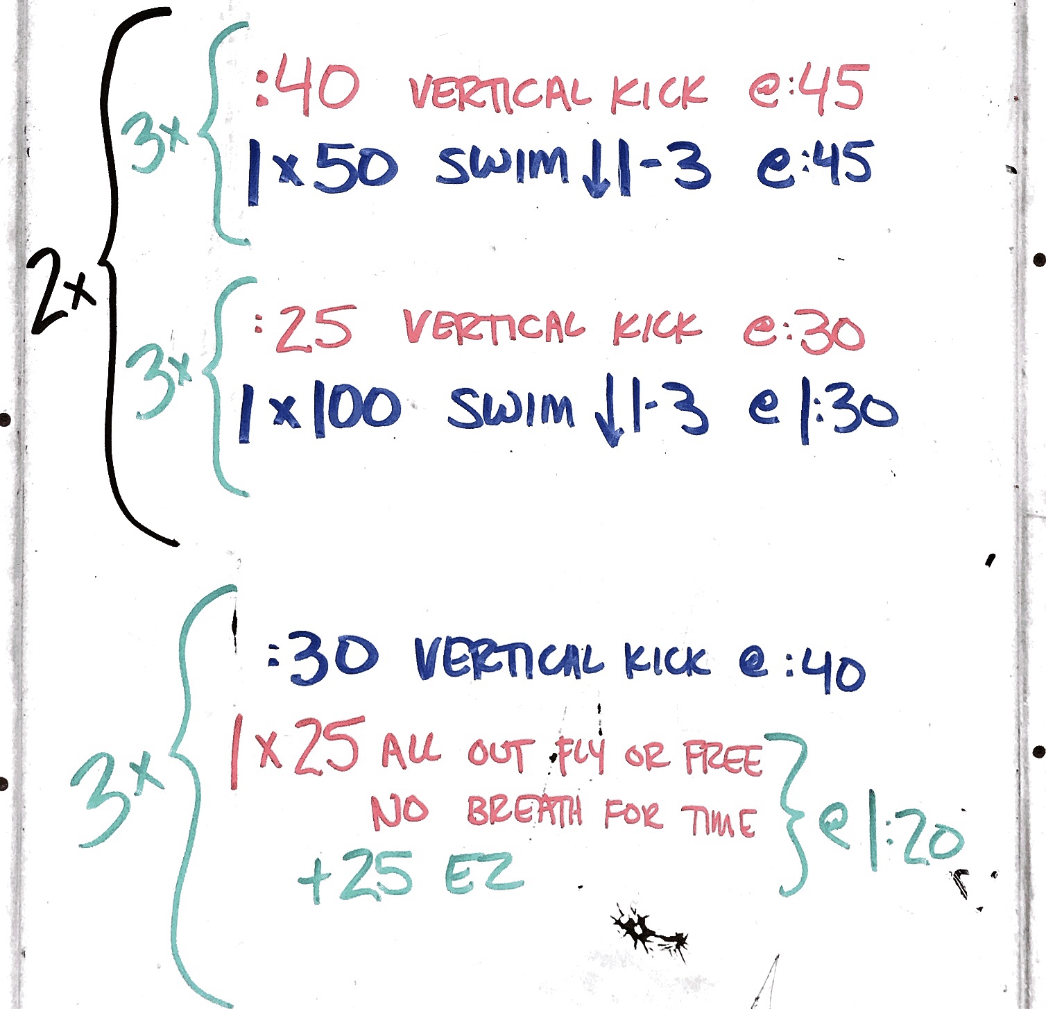 – 2 minutes vertical kick, last 30 seconds all out kick in streamline